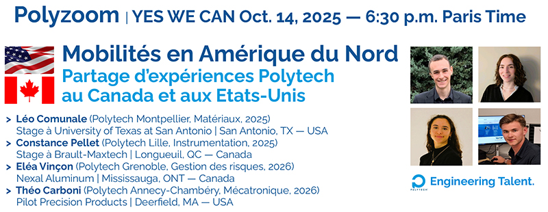 Polytech America organise une table ronde en ligne de partage d'expériences de mobilités en Amérique du Nord le 14 octobre à 18h30 (heure française). |