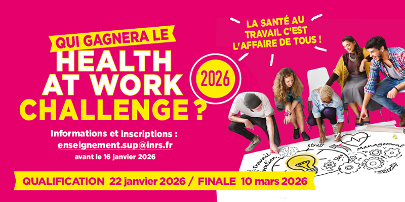 L’INRS organise pour la troisième année, le Health at Work Challenge, un concours national ouvert gratuitement aux étudiants. Au programme : analyser des situations de travail réelles en s’immergeant, par équipes, dans une entreprise virtuelle, proposer des solutions pour améliorer les conditions de travail et défendre, pour les meilleures, leur projet devant un jury. Deux temps forts : - 22 janvier : phase de qualification (à distance, à l'école donc). - 10 mars : grande finale à Paris, au siège de l’INRS