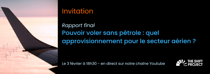 Aéro Décarbo et The Shift Project nous invitent à la présentation de leur rapport final : « Pouvoir voler sans pétrole, quel approvisionnement énergétique pour le secteur aérien ? », le mardi 3 février à 18h30 en direct sur Youtube, en présence de Jean-Marc Jancovici et des auteurs du rapport.